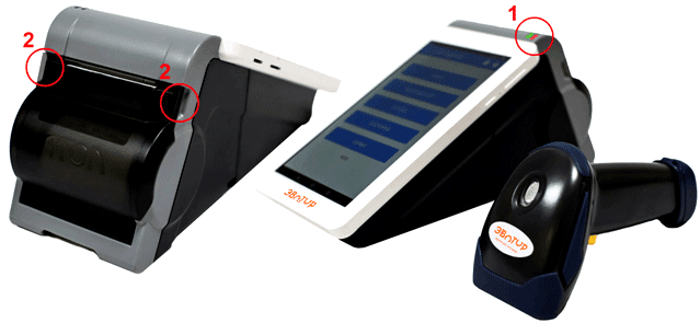 После включения системы (выключатель расположен в нижней части корпуса справа) в случае правильной установки рулона с чековой лентой загорается зелёный индикатор (фрагмент 1 на рисунке) и на чековую ленту выводится сообщение «ПД готов к работе». При неправильной установке ЧЛ или её отсутствии загорается красный индикатор, расположенный правее зелёного.